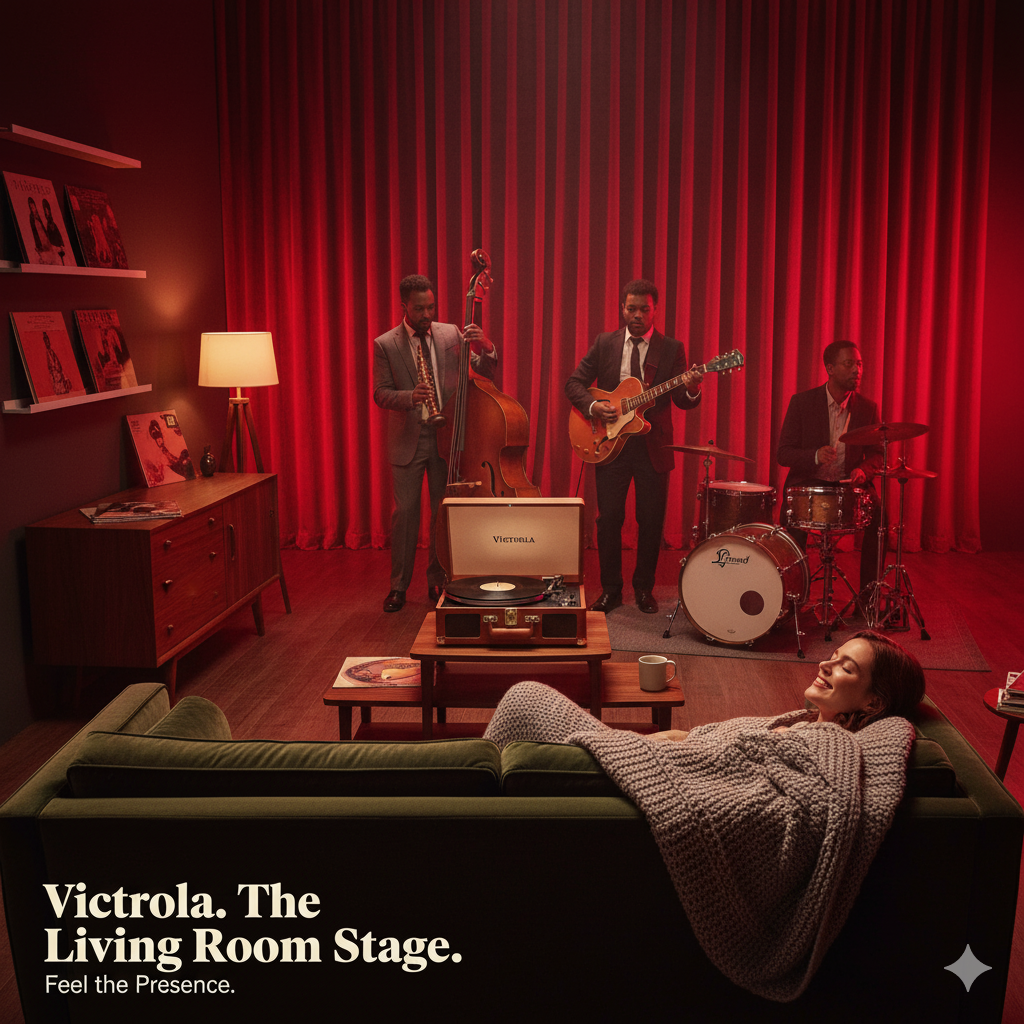 This concept captures the true, visceral power of vinyl—it’s not passive listening, it’s an exclusive, emotional experience delivered right in your home. We launch with a striking visual, transforming a chic, mid-century living room into a moody, red-lit jazz club, complete with velvet curtains and the literal presence of a live band performing beside the Victrola.